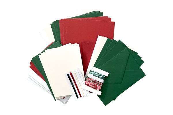 Create the perfect card for the perfect occasion. With this card and envelope set, you will have everything you will need to create a one of a kind card for a loved one. In this set, you will receive 20 cards and envelopes; 5 of each color (red, green, ivory and white), 40 blank cardstock sheets: 10 sheets of each color (red, green, ivory and white), Bakers Twine and Satin Ribbon. Cut, glue, tape and draw all over these blank cards to create a gift for someone that they have never seen before!