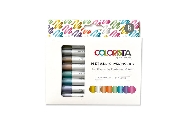 This set of Metallic Markers is full of amazing colors you are guaranteed to love. This eight piece set features markers with a 2 mm bullet tip, which offers control and precision for neat lines and fine details. Made with a water-based metallic pigment, these inks will look amazing on dark-colored papers and are fully opaque when dry. Perfect for coloring, journaling, cards, scrapbook pages, and more.