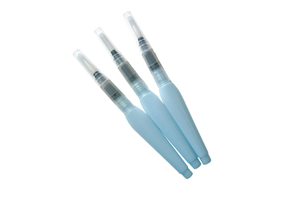 This waterbrush set includes three rounds in fine, medium and broad. The durable, nylon bristles of these self-wetting brushes hold a point and can create broad strokes as well as fine lines. The soft easy-to-squeeze barrel is comfortable to hold and it contains the water needed to create a beautiful watercolor painting.